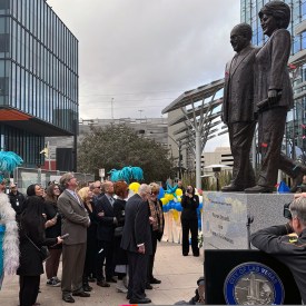 Develan escultura de los alcaldes Carolyn G. y Oscar B. Goodman en el Ayuntamiento de Las Vegas