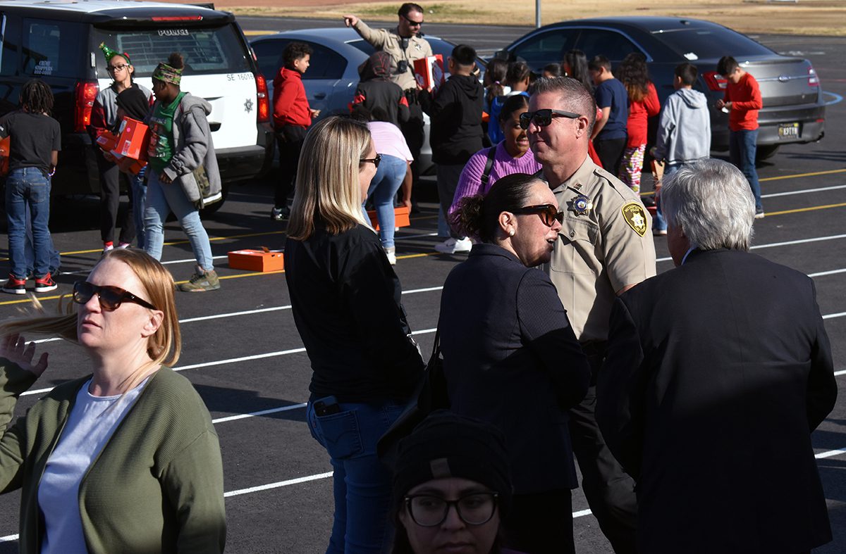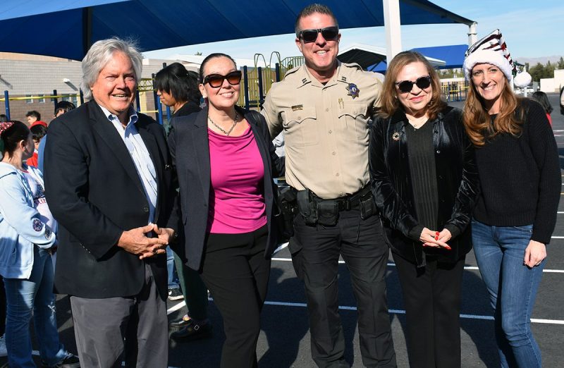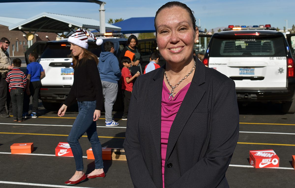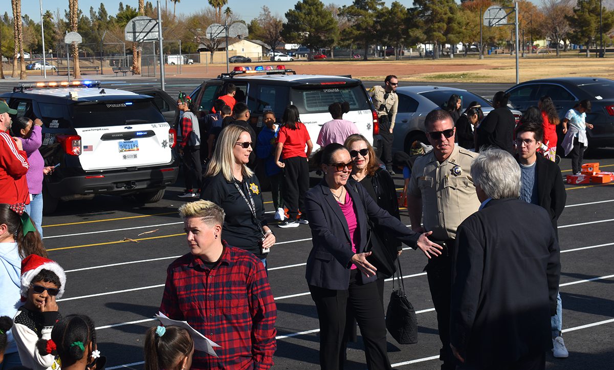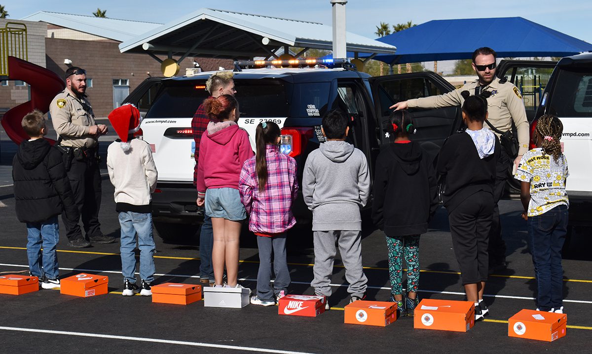 Los alumnos de la escuela primaria Snyder recibieron tenis gratis de Shoes That Fit; fue un esfuerzo coordinado por el comisionado Tick Sergerblom y apoyado por Patricia Cortés Guadarrama, cónsul de México en Las Vegas y oficiales del Comando del Área Sureste de LVMPD.
