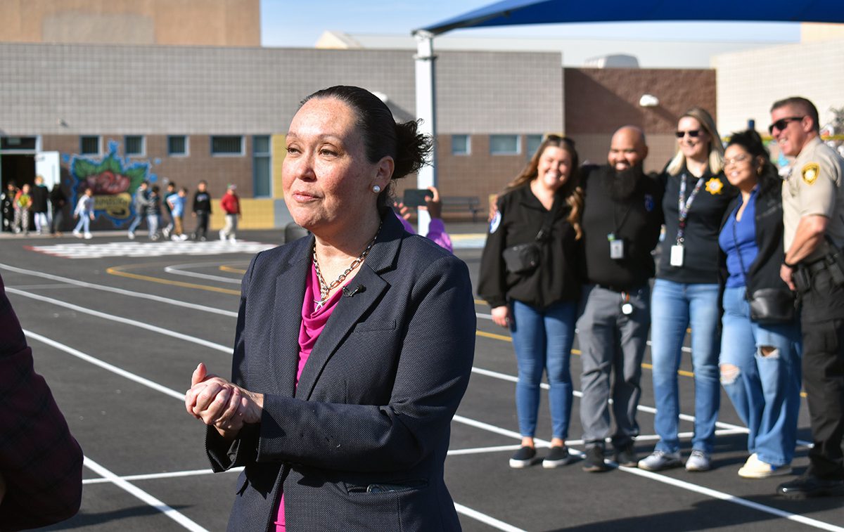 Los alumnos de la escuela primaria Snyder recibieron tenis gratis de Shoes That Fit; fue un esfuerzo coordinado por el comisionado Tick Sergerblom. En la foto, la fideicomisaria Linda Cavazos conversa con la cónsul de México, Patricia Cortés Guadarrama. El jueves 19 de diciembre de 2024 en el 4317 E Colorado Ave. (Frank Alejandre / The Nevadan / El Nevadense)