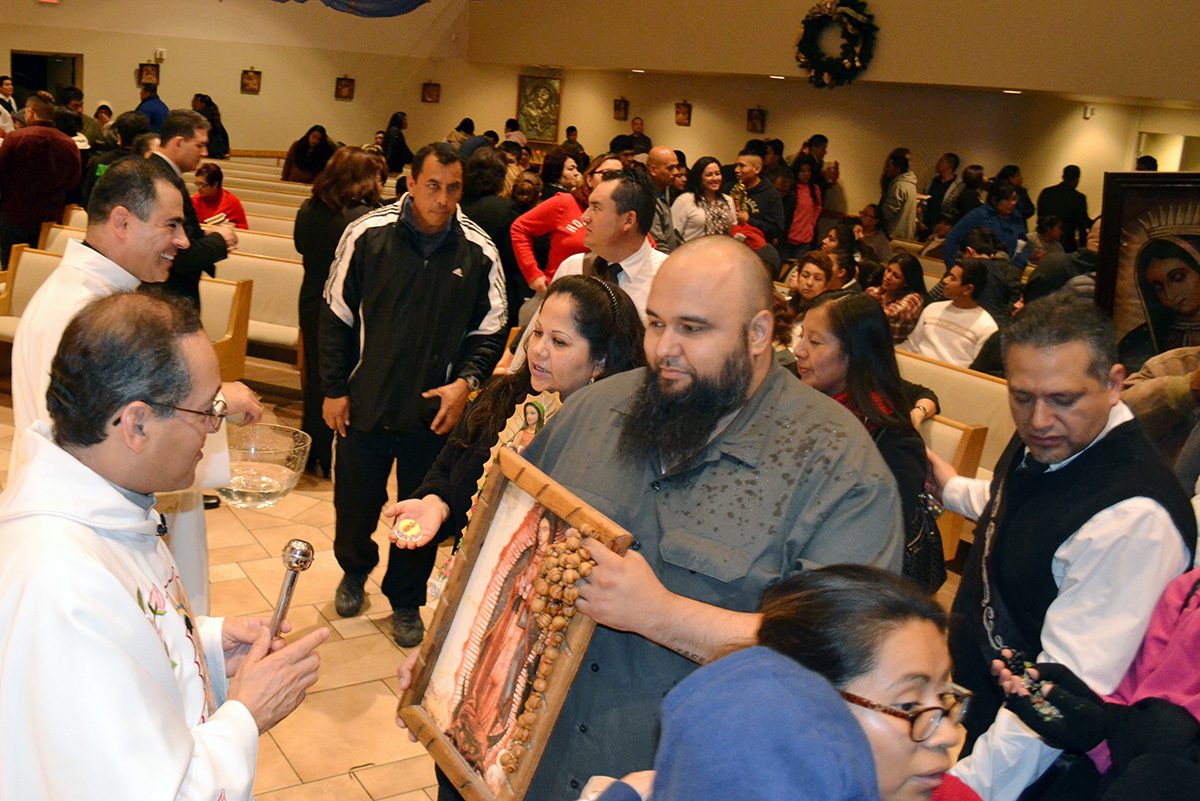 Este 12 de diciembre distintos eventos religiosos en español tendrán verificativo en distintas iglesias del valle de Las Vegas. Después de las misas generalmente se realizan festivales donde se presentan grupos musicales y danzantes En la foto, fieles llevan a bendecir imágenes de la Guadalupana. (Frank Alejandre / The Nevadan / El Nevadense)