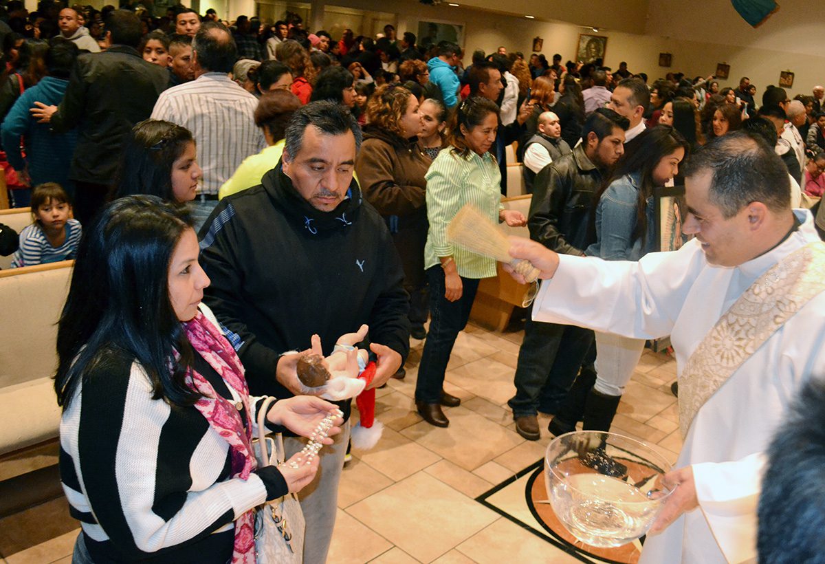 Este 12 de diciembre distintos eventos religiosos en español tendrán verificativo en distintas iglesias del valle de Las Vegas. Después de las misas generalmente se realizan festivales donde se presentan grupos musicales y danzantes. En la foto, el sacerdote de la parroquia San Francisco de Sales bendice un Rosario y un Niño Dios. (Frank Alejandre / The Nevadan / El Nevadense)