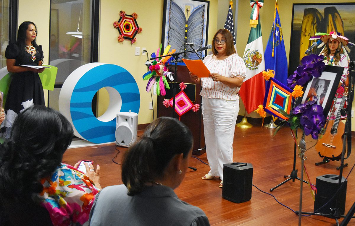 Selene Lozada, directora de Parent Leadership Team (PLT) habló de la vasta obra literaria de Amado Nervo. El martes 27 de agosto en el Consulado de México en Las Vegas. (Frank Alejandre / The Nevadan / El Nevadense)
