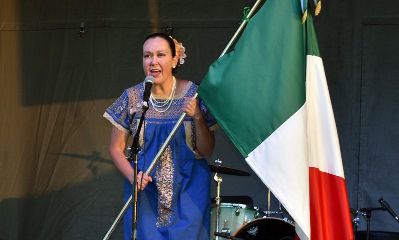 Luego de la presentación de la diplomática mexicana, una escolta le entregó la bandera en el escenario del parque, la cual aceptó para después gritar la tradicional “arenga” de Miguel Hidalgo, el tradicional “Grito de Dolores”.
