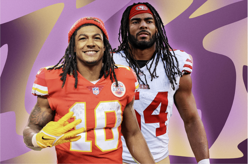 Isiah Pacheco (10), corredor de los Jefes de Kansas City, es de ascendencia puertorriqueña y dominicana, mientras que Fred Warner (54), apoyador de los 49ers de San Francisco tiene ascendencia panameña y mexicana. (Fotocaptura de Remezcla)