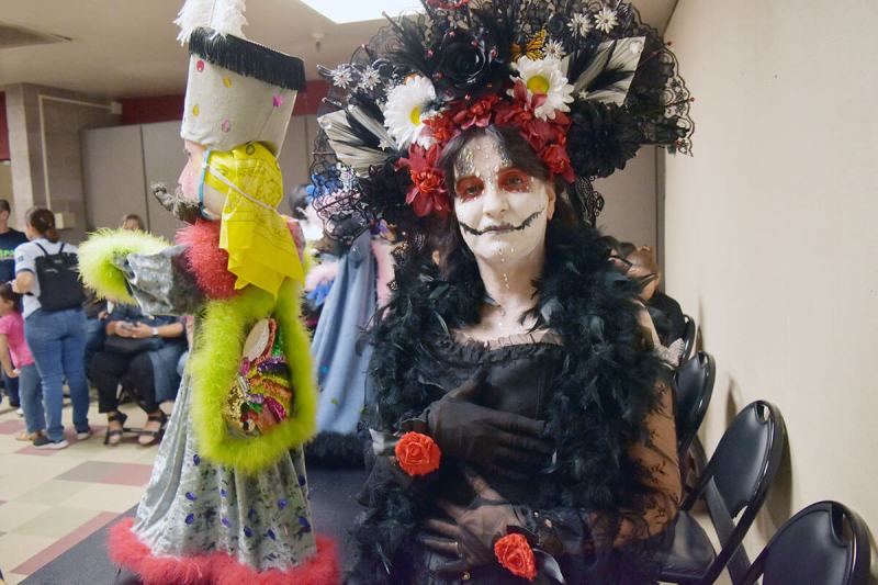 El atuendo de La Catrina que confeccionó Elda tiene elementos destacados como una diadema, y debido a su complejidad le tardó más de una semana en elaborarlo.