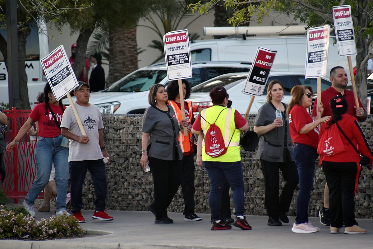 Han pasado muchos años desde que todo el Strip no estaba sindicalizado, con la firma de The Venetian y Palazzo se logra una victoria histórica para la comunidad latina agremiada a la Unión Culinaria Local 226. En la foto, manifestantes que hicieron presión para darle fuerza a las demandas de trabajadores del Virgin Hotels el jueves 11 de abril de 2024. (Frank Alejandre / The Nevadan / El Nevadense)