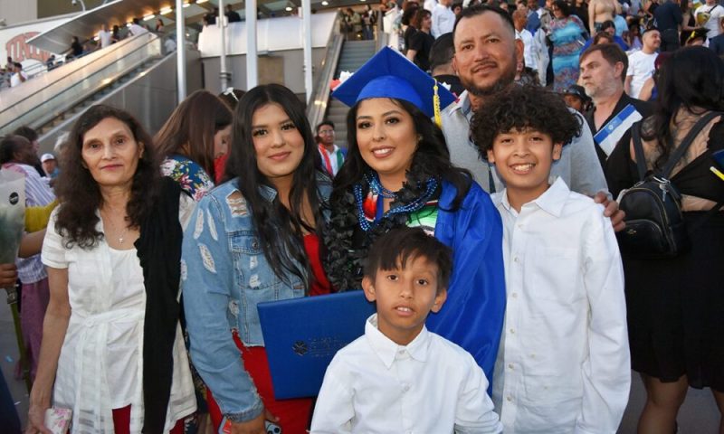 Janeth Vázquez se mostró orgullosa de haber concluido esta etapa de su vida académica, se la dedica a su familia y la comunidad latina que radica en el sur de Nevada. Aquí posa flanqueada por su familia, luego de recibir su título universitario. El lunes 13 de mayo de 2024 en el Thomas & Mack Center. (Foto Frank Alejandre / The Nevadan / El Nevadense)