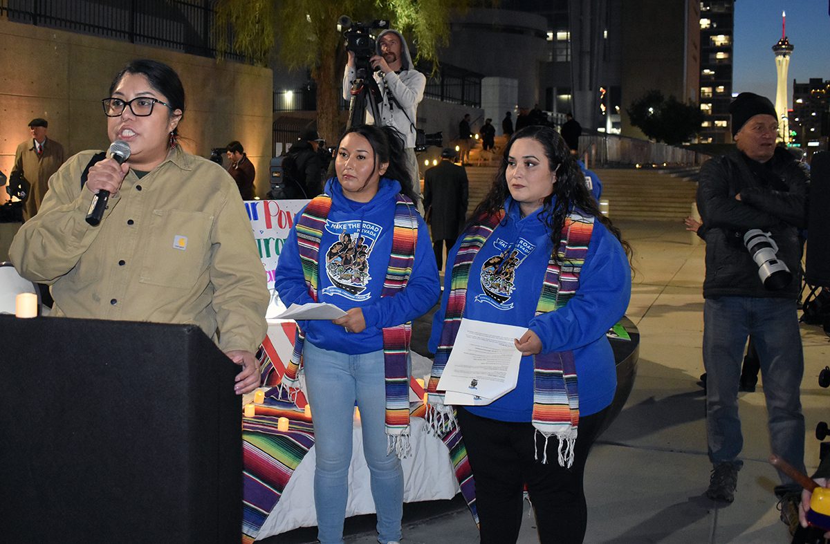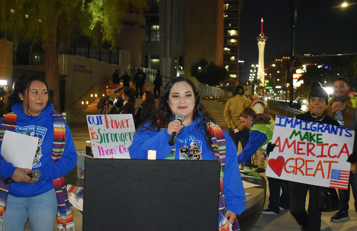 “Esta noche nos unimos para alzar nuestra voz (contra) políticas dañinas que no sólo perjudican a nuestras familias, sino también ponen en riesgo nuestro futuro”, aseveró Samuel Cano, de la organización -sin fines de lucro- Make The Road Nevada, agregando “No están solos en esta lucha, hay gente que está dispuesta a ayudarnos. Este también es nuestro hogar. No necesitamos vivir en las sombras toda nuestra vida, por eso estamos aquí para seguir adelante con eso”.