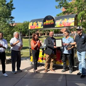 Clark County issued its first sidewalk vendor license this week to a family-run popsicle and aguas frescas (fruit drinks) stand, a month after Commissioners approved the ordinance that established the requirements, including hours of operation, licensing fees, and cart size limits.