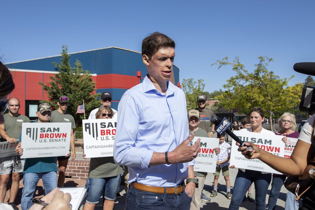 FILE – Nevada Republican US Senate candidate Sam Brown speaks to media after voting at Reno High School in Reno, Nev., June 14, 2022. (AP Photo/Tom R. Smedes)
