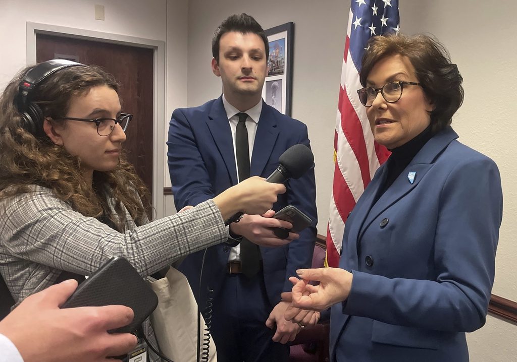 US Sen. Jacky Rosen, right, speaks with local media shortly after her speech at the Nevada Legislature in Carson City, Nev., Monday, April 3, 2023. (AP Photo/Gabe Stern)