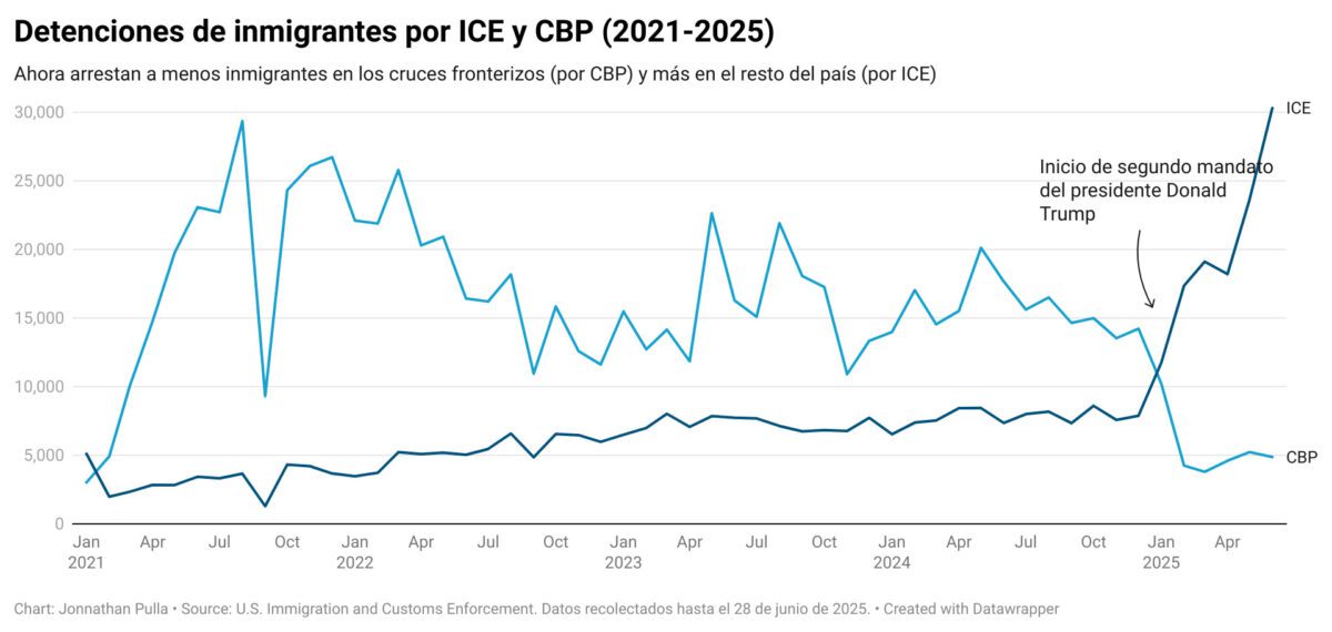 En cambio, los datos de los inmigrantes detenidos en el resto el país (zonas no fronterizas) realizados por ICE, muestran que en el último trimestre de 2024, el promedio diario de arrestos fue de 262 personas, mientras que a partir de enero de 2025, la cantidad ascendió a 666 detenidos por día, con un pico de 1,011 detenidos diarios en junio (en total se detuvieron 30,328 en ese mes, según datos recogidos por Factchequeado hasta el 28 de junio).