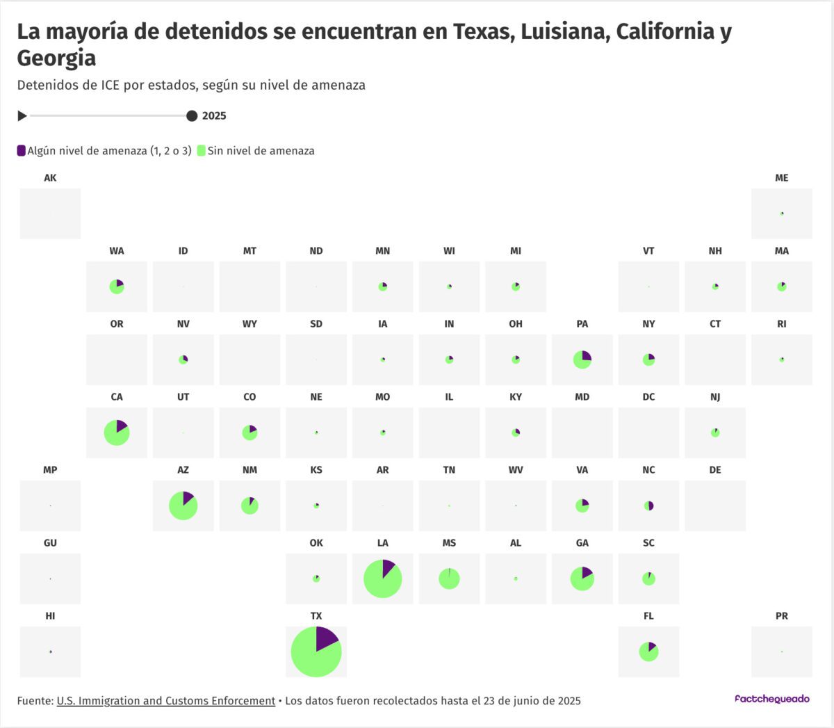 Según los datos recolectados hasta el 23 de junio, el 84% de los inmigrantes detenidos (39,722 personas) en centros de detención se encuentra en la categoría “sin nivel de amenaza ICE”. El nivel de amenaza 1 representa el 7% (3,371 personas); el nivel 2, el 4% (1,801); y el nivel 3, el 5% (2,338). La mayoría de los detenidos bajo todas las categorías de arrestados se encuentran en centros de detención en Texas, Luisiana, Arizona, California y Georgia.