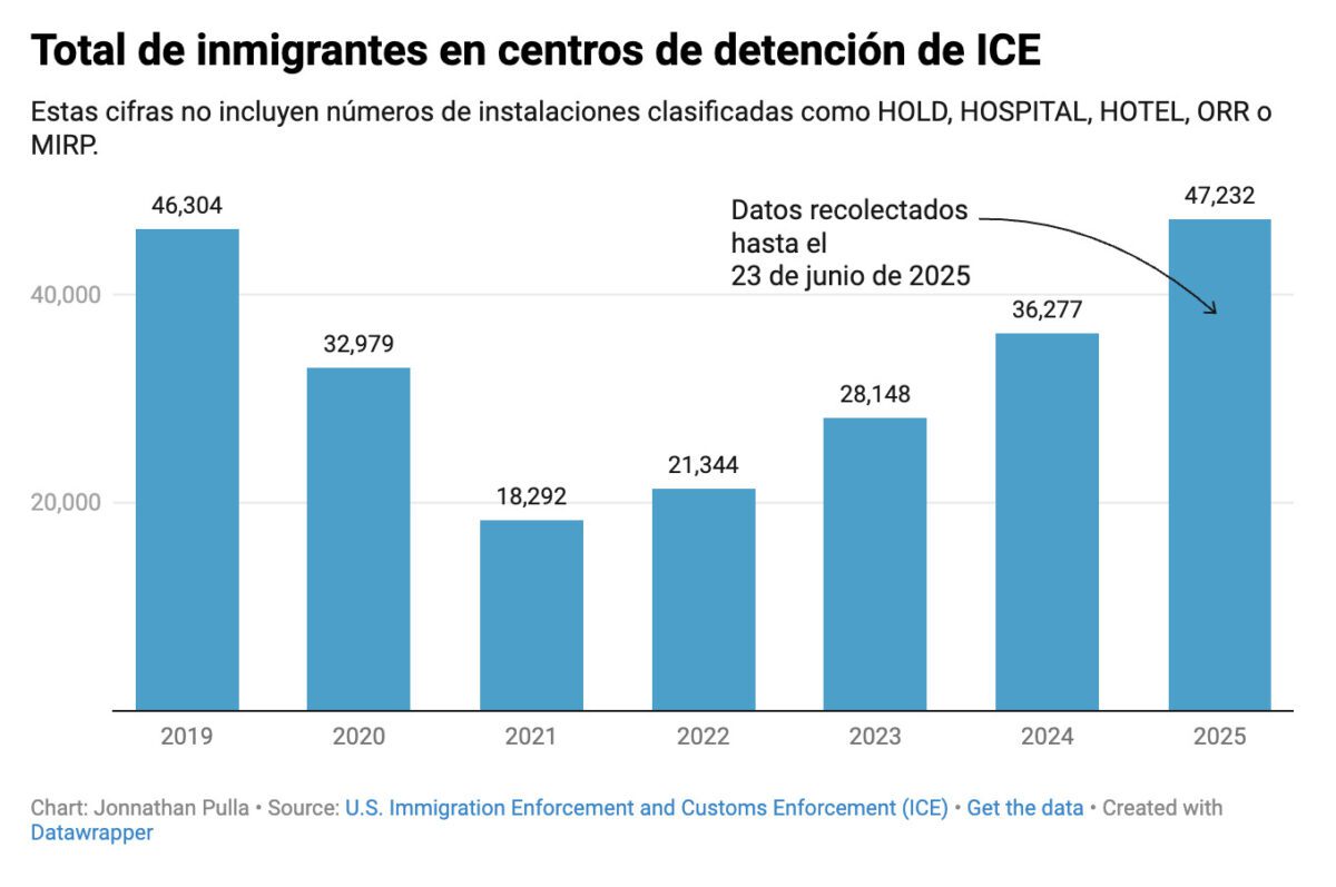 Los datos también muestran que el año fiscal 2025 ya ha superado el número de detenidos en centros de detención registrado en el año fiscal 2019 (46,304). Las cifras recolectadas hasta el 23 de junio de 2025, muestran que hay 47,232 personas en los centros de detención y aún faltan tres meses para que termine el año fiscal (que va del 1 de octubre de 2024 y concluye el 30 de septiembre de 2025).