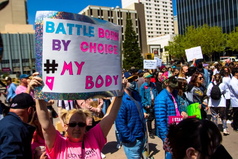 RENO, NEVADA, UNITED STATES – 2022/05/07: A woman holds up a placard in a pro-choice march. Protestors gathered to voice their anger at the leaked Supreme Court documents. (Photo by Ty O'Neil/SOPA Images/LightRocket via Getty Images)