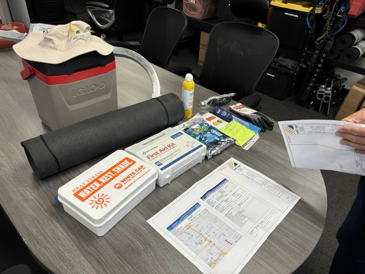 The work day for Hernandez and his crew begins at 6 a.m. sharp. To combat the heat, Hernandez has made it standard practice to dispatch each crew with supplies to get through the day: portable coolers with ice and bottled water; sugar-free electrolyte packets; cooling packs; sunscreen; foam mats to avoid burns if they need to lie down on pavement or a rooftop; as well as directions to the nearest hospital and a list of emergency contacts.